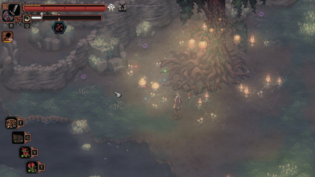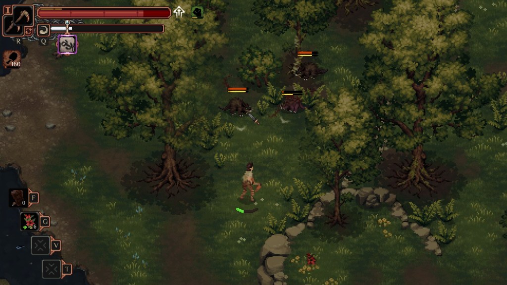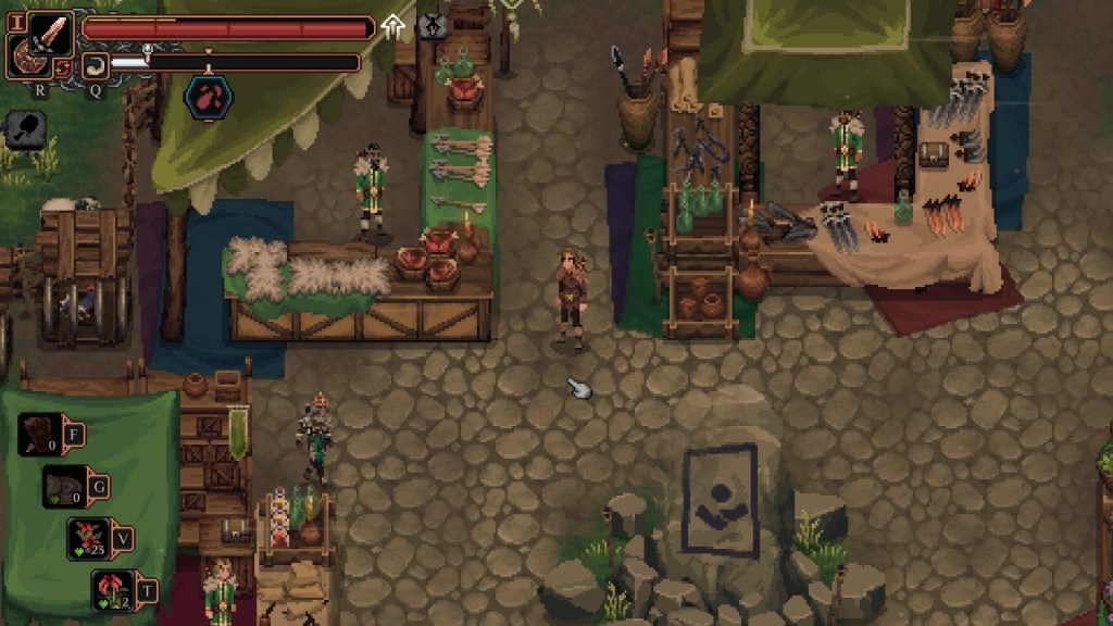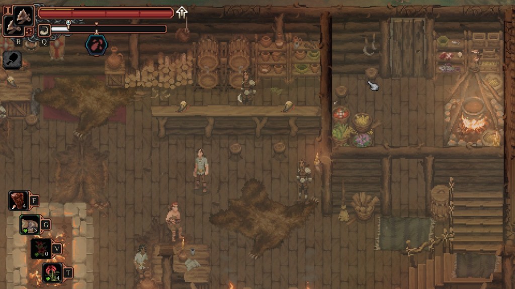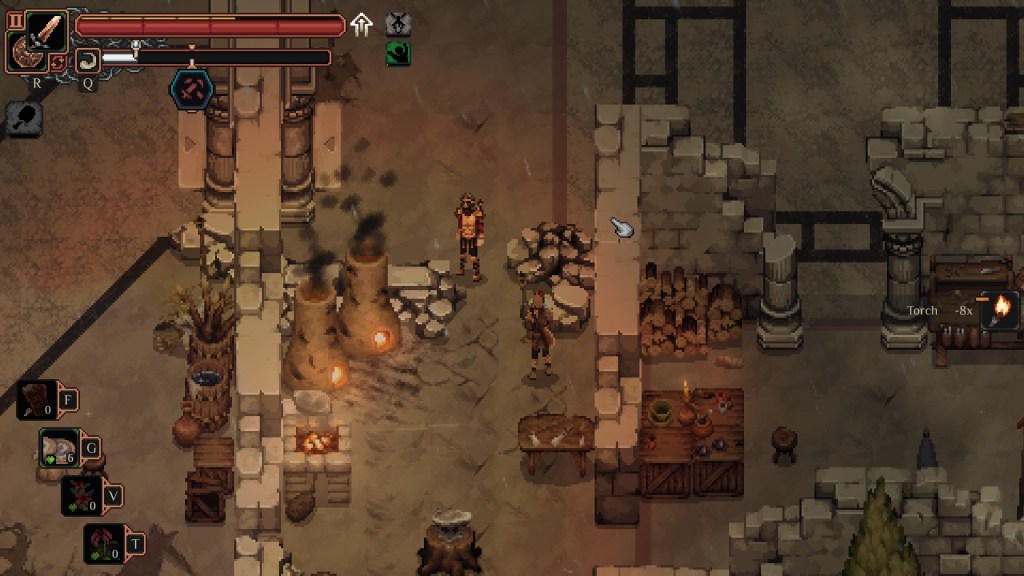Öncelikle tutku projesi olduğu her yerinden belli olan bu oyunun görselliği ile ilgili konuşmak istiyorum. Pixel art bir oyunu ilk defa oynamıyorum elbette ama, Drova gerçekten büyüleyici bir evren yaratarak aklıma uzun süreler kazanacak bir Pixel art örneği sunuyor. Oluşturdukları haritalardaki detaylar, kırılabilen eşyalar ve etkileşime geçilebilen çevre detayları ile, adeta oyuncuyu haritaya yerleştiriyor. Bu çevre detayları ve ortamlara gösterilen özen kesinlikle oyunun güçlü yanlarından. Kullanılan renkler sayesinde oyunun başında ne kadar uzun süre kalırsam kalayım, asla içim daralmadı. Etrafı seyretmekten her zaman keyif aldım ve gezinmekte olduğum haritalardan ayrılmak istemedim adeta.
