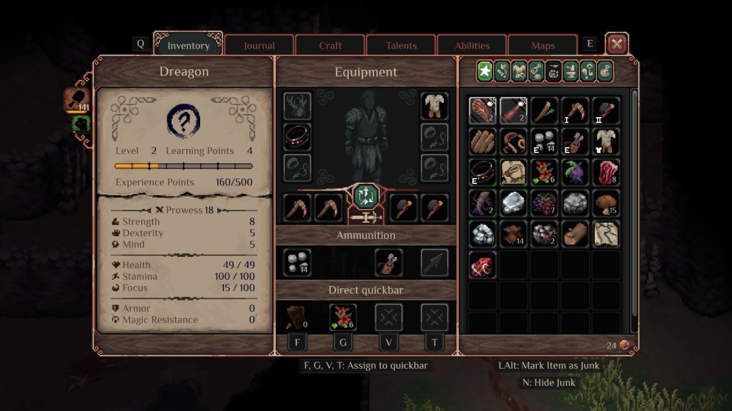 Oyunda toplanabilen incik boncuk tarzı eşya sayısı ne kadar fazlaysa, gerçekten işe yarayan ekipman sayısı da bir o kadar az. Açıkçası oyunlarda çevreden çiçek böcek toplamayı pek seven birisi olmadığım için, envanterimdeki o çöplük birikintisi beni ekstra rahatsız etti. Bir de, oyunda demir, gümüş, bronz gibi kaynakları toplayabiliyoruz. Uzun bir süre bu kaynaklarla belki zırh yapılıyordur gibi düşüncelerle topladım bu madenleri, fakat hiç bir işe yaramıyorlar. Yüzük ve tuzak gibi bazı şeylerin yapımında kullanılabiliyorlar evet ama neden zırh ve kılıç yapamadığımızı anlamadım. UI konusunda gayet temiz ve kullanışlı bir UI olduğunu vurgulamak isterim. Oyunun UI konusunda kesinlikle bir eksiklik bulunmamakta. Eşyaları kategorize ederek, o çöpe dönen çantayı bir nebze çekilebilir hale getirmeyi başarmışlar. Oyunda becerileri seçtiğimiz ekranı en başta anlamakta zorluk çektim, fakat daha sonra alıştım.
