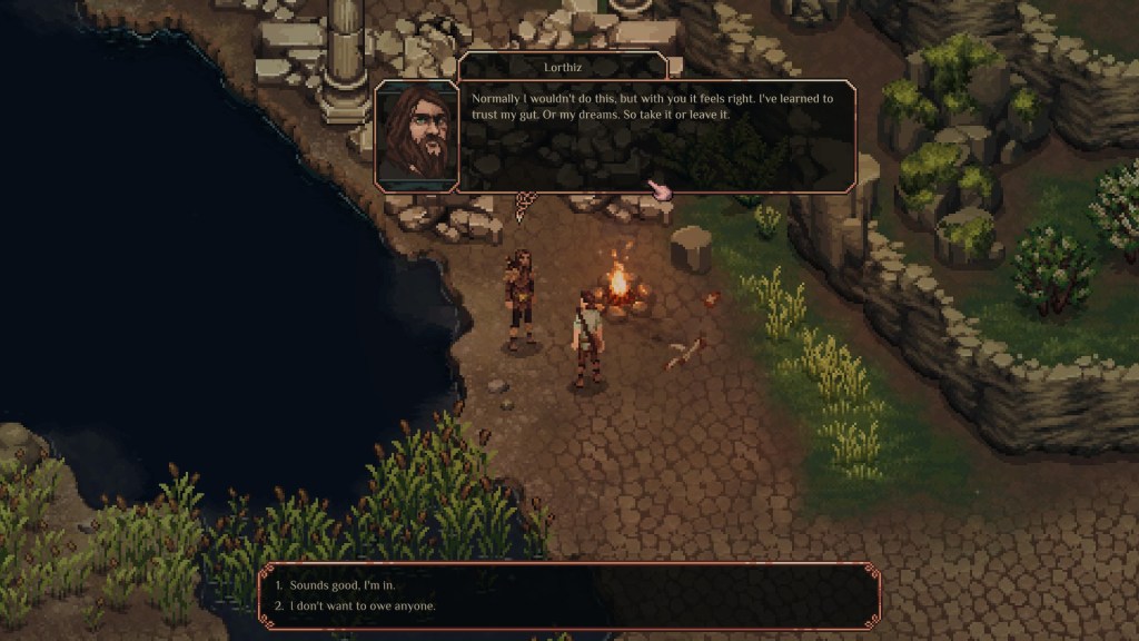 Haritalar sadece birer UI element değiller, oyunda diğer eşyalar gibi satın aldığımız ve üzerlerine işaretler koyarak düzenleyebildiğimiz birer yardımcı eşya olarak kullanılıyorlar. Bu tarz oyuncusuna güvenen oyunları seviyorum, aslında bu hem oyuncuya hem de oyunlarına duydukları güvenden kaynaklanıyor. Şimdi gelelim o kısma, harita dizaynı ve seyahat etme kısmından bahsediyorum. Drova izometrik bir bakış açısı kullanmanın dezavantajlarından birini burada malesef ağır ağır taşıyor. Haritalarda gezerken nereden yürünüp nereden yürünemeyeceğini anlamakta o kadar zorlandım ki, yer yer gerçekten iç çektiğim oldu. Özellikle bazı engeller o kadar mantıksız duruyor ki, yahu bu adam şurayı da tırmanamıyorsa ölsün dediğim çok oldu. Oyunlarda artık mantıksız engel yerleştirme görmek istemiyorum gerçekten. Lütfen sevgili oyun yapımcıları, önümüzü tıkayacaksanız çok mantıklı şekillerde yapmaya özen gösterin bunu. Yere devrilmiş bir ağaç yüzünden kimse yol değiştirmez. İnsanız biz yahu, eskiden maymunduk, unuttunuz mu?